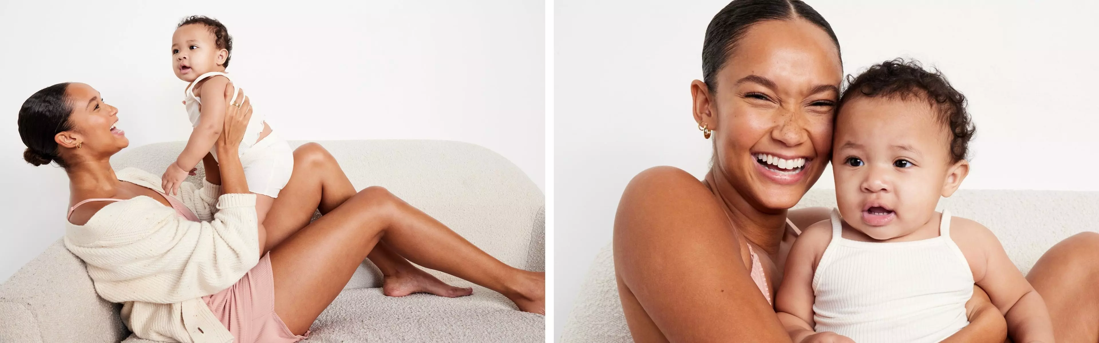 Une femme et un bébé portent tous deux des ensembles de vêtements de détente.
