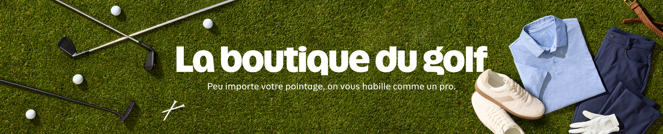 Articles Old Navy pliés sur le gazon, près de bâtons et de balles de golf.