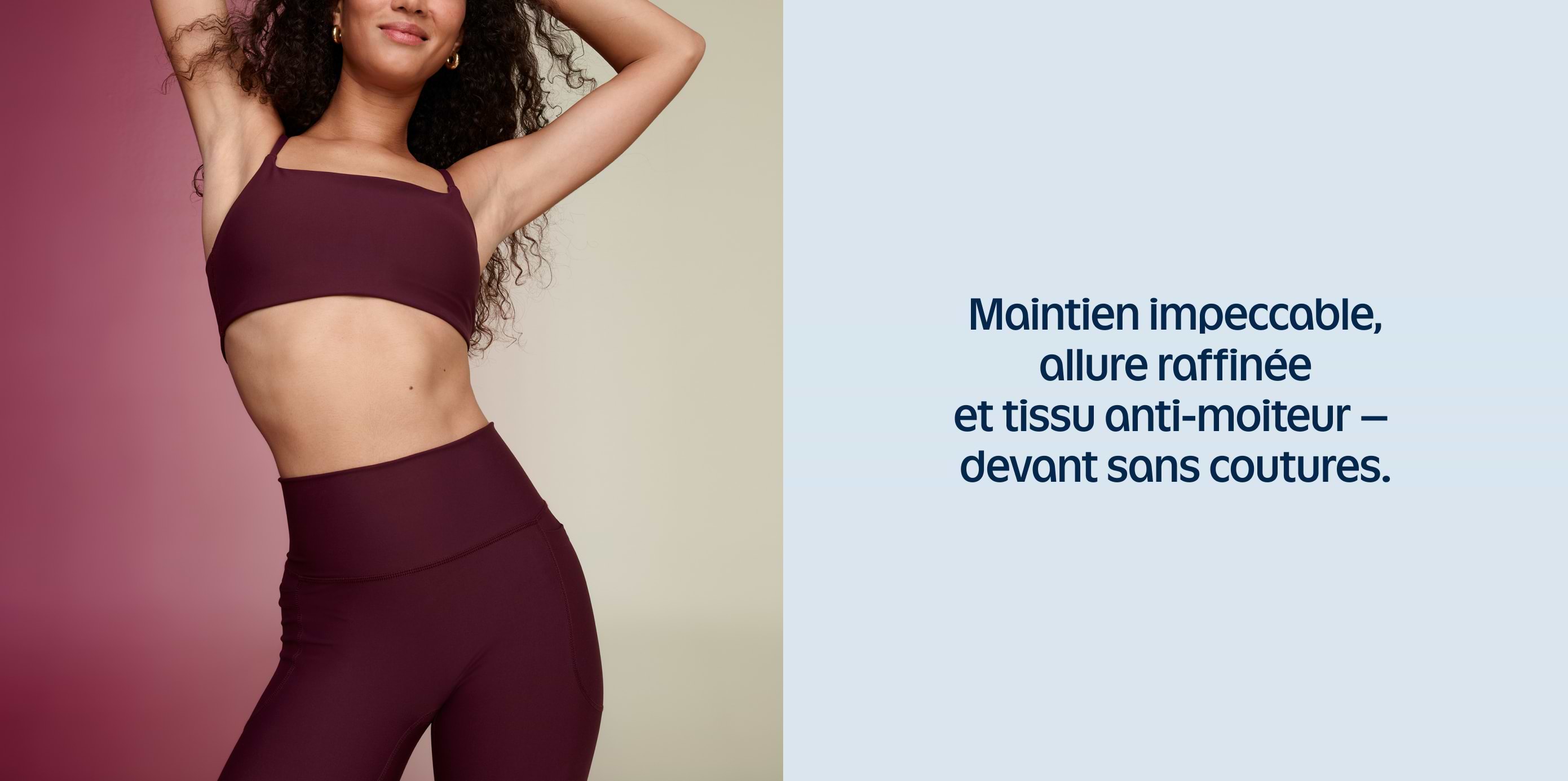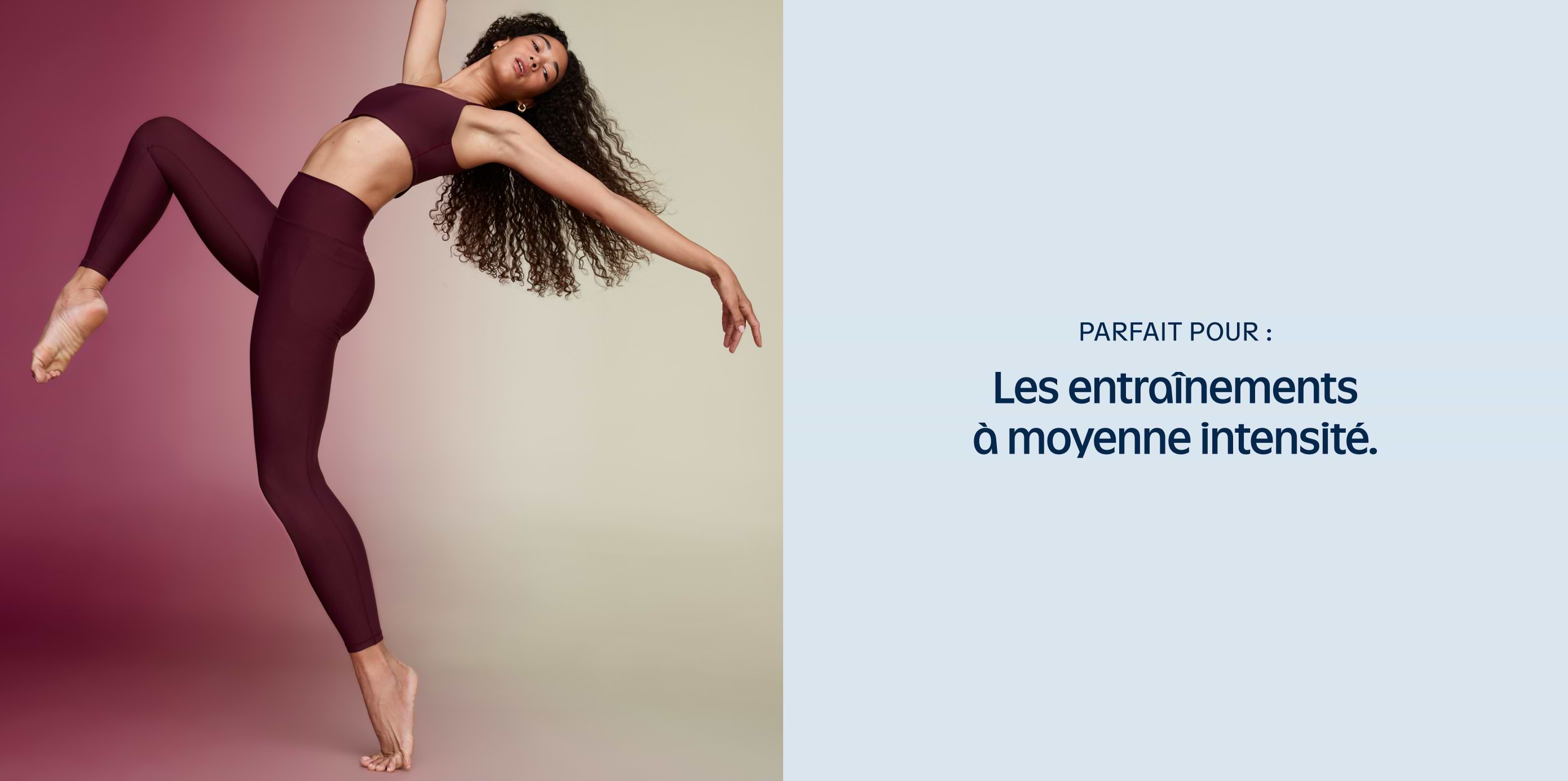 Person in burgundy activewear leaping in a dynamic pose; text reads: “Parfait pour: Les entraînements à moyenne intensité.”