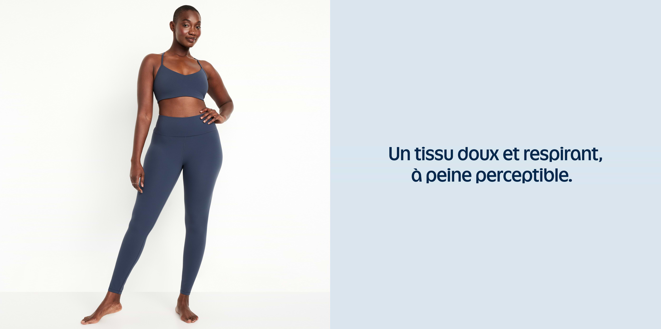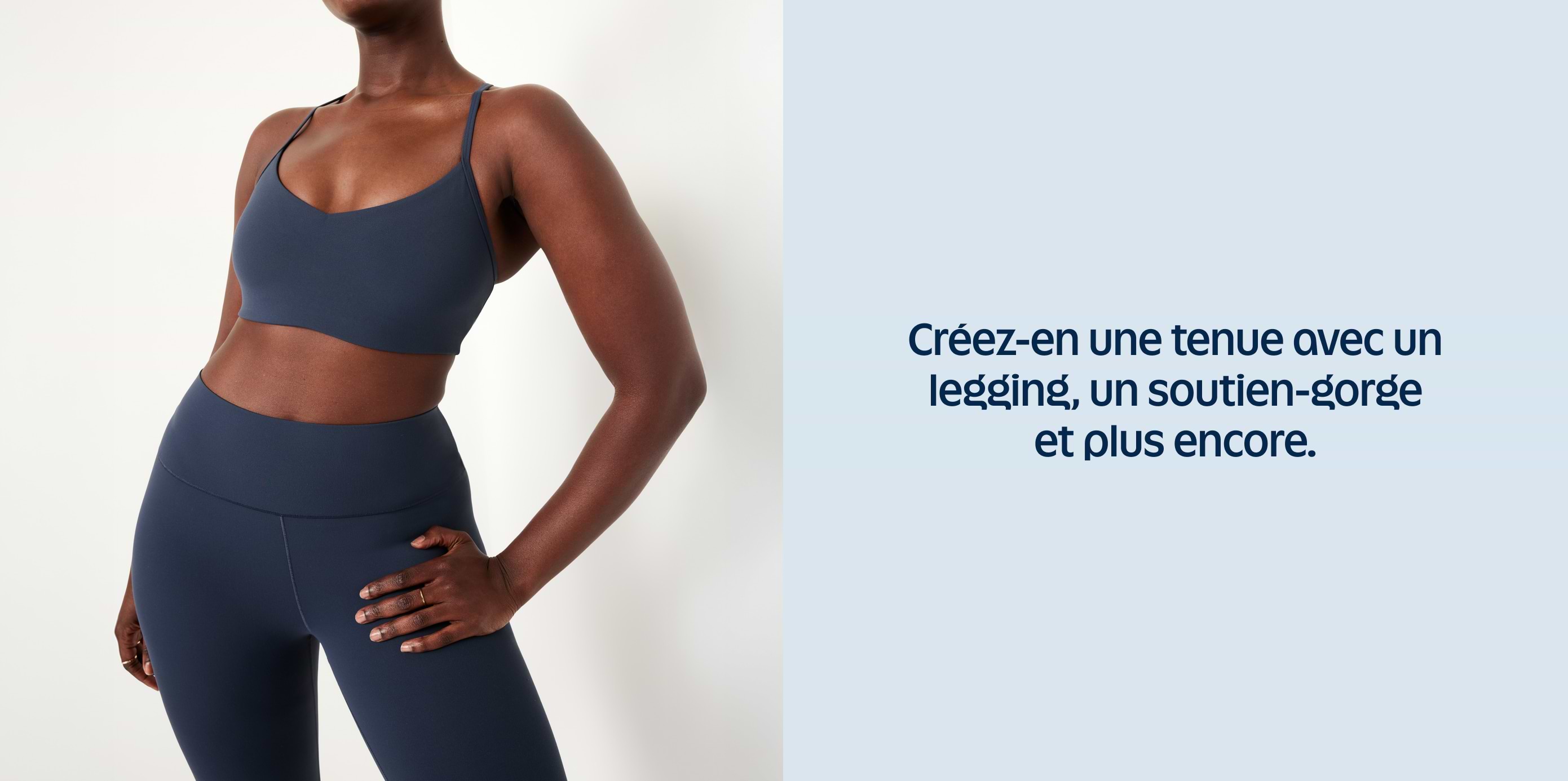 Person wearing navy sports bra and high‑waisted leggings; French text reads “Créez‑en une tenue avec un legging, un soutien‑gorge et plus encore.”