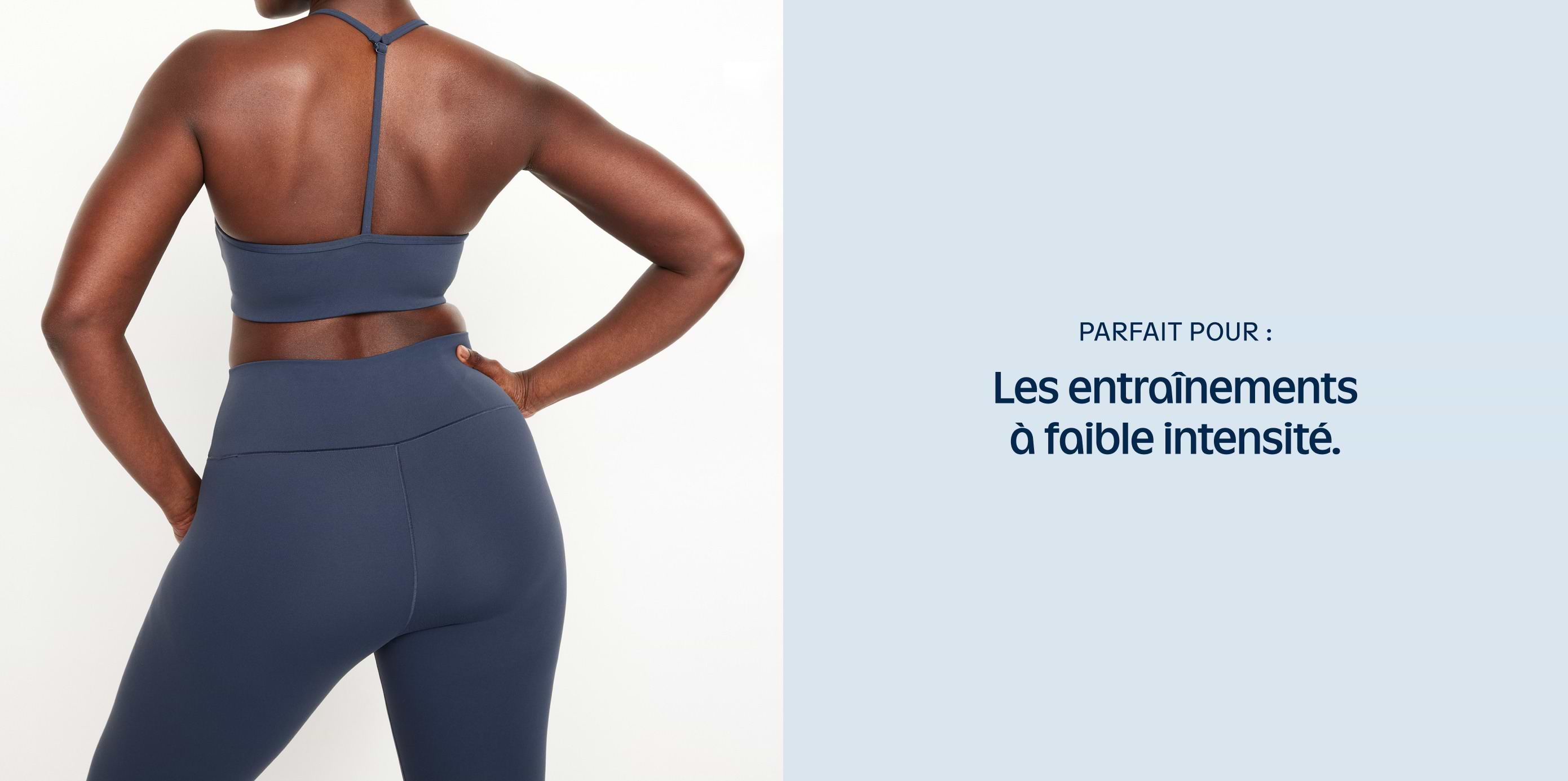 Back view of a person wearing a navy sports bra and high‑waisted leggings; text on the right reads “Parfait pour: Les entraînements à faible intensité” (perfect for low‑intensity workouts).